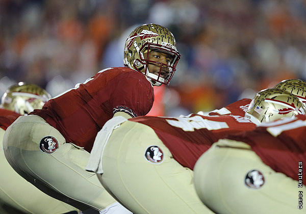 Квотербэк команды Florida State Seminoles Джамес Уинстон во время игры против Auburn Tigers.
