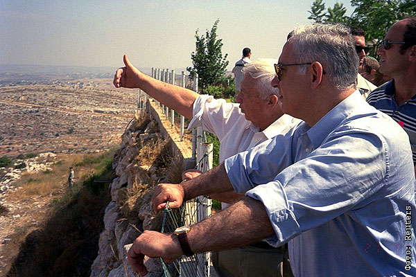 Ариэль Шарон и Беньямин Нетаньяху осматривают территорию западного побережья реки Иордан.