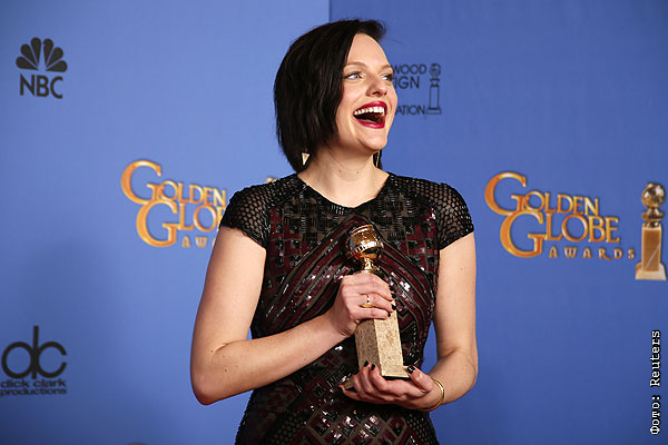 Элизабет Мосс со своей наградой в номинации "Лучшая актриса минисериала или телефильма", полученной за роль в новозеландском минисериале "Вершина озера".