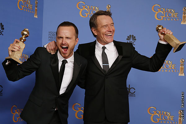 Аарон Пол и Брайан Крэнстон празднуют признание сериала "Во все тяжкие" лучшей телевизионной драмой 2013 года.