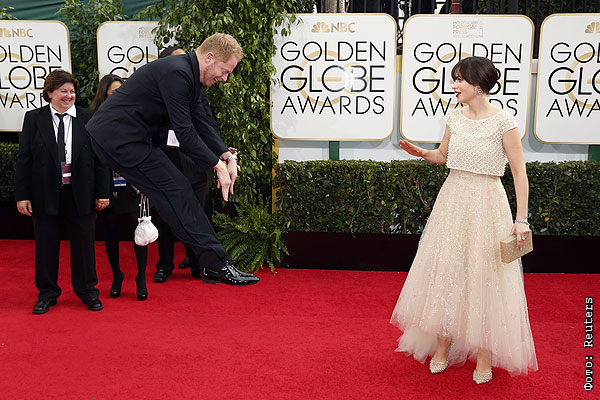 Джесс Тайлер Фергюсон подпрыгивает перед Зои Дешанель на церемонии вручения наград "Золотой глобус".