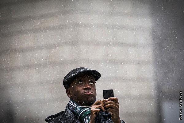 Житель Нью-Йорка фотографирует метель на Манхэттене.