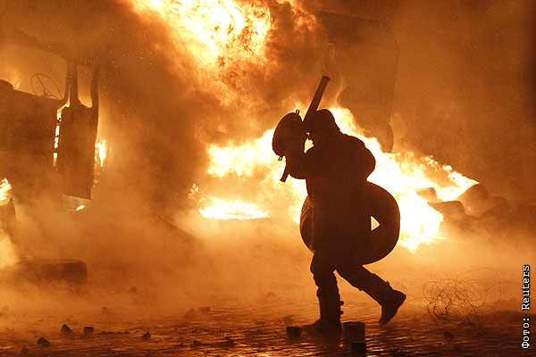 Митингующие жгут резиновые покрышки на улице Грушевского в Киеве.