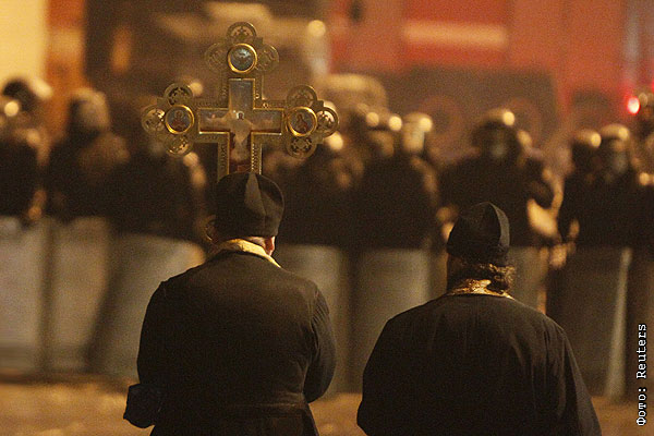 Священники с крестами выступили против сотрудников органов внутренних дел на одной из улиц Киева.