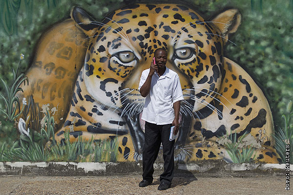 Строитель разговаривает по телефону в Манаусе, что на севере Бразилии.