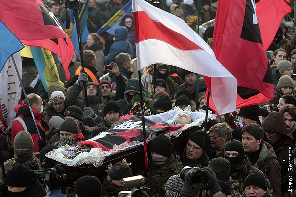 В воскресенье в Киеве прошли похороны активиста Евромайдана Михаила Жизневского. По данным СМИ, он состоял в националистической организации УНА-УНСО. Жизневский скончался от огнестрельных ранений, полученных в ходе столкновений между протестующими и милицией на улице Грушевского.