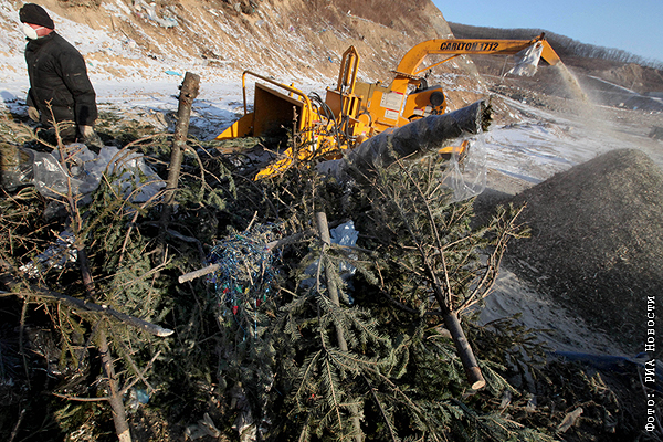 Сотрудники коммунальных служб во Владивостоке уничтожают ели, выброшенные местными жителями после праздников