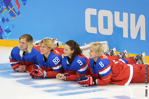 Слева направо: Юлия Лескина, Екатерина Смолина, Александра Вафина, Лия Гаврилова (Россия) во время фотосессии женской сборной России по хоккею перед тренировкой на XXII зимних Олимпийских играх в Сочи.