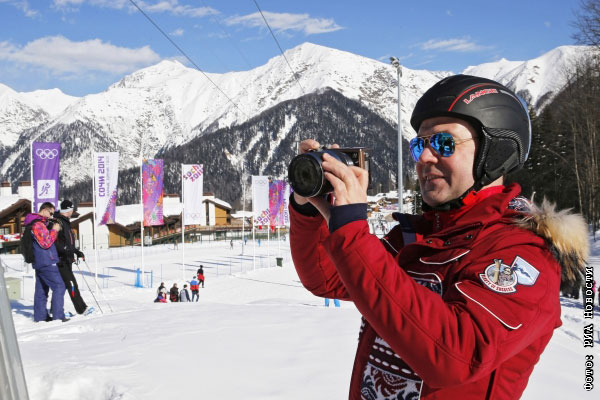 Председатель правительства России Дмитрий Медведев фотографирует на территории Главной горной деревни ХХII зимних Олимпийских игр в Красной Поляне.