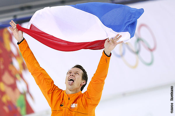 Стефан Гротхейс из Нидерландов становится чемпионом в скоростном беге на коньках на дистанции 1000 м.