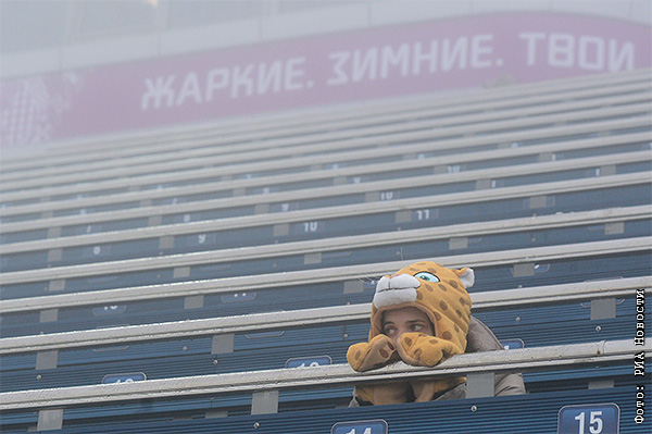 Болельщица грустит на трибуне перед началом гонки с масс-старта в соревнованиях по биатлону среди мужчин на XXII зимних Олимпийских играх в Сочи.