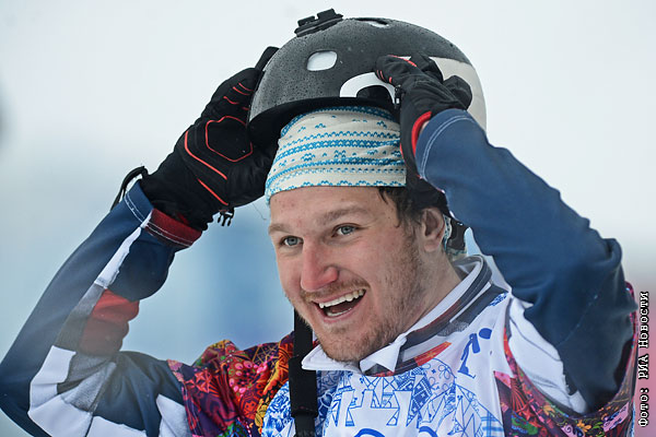Николай Олюнин (Россия), завоевавший серебряную медаль, после окончания финала сноуборд-кросса на соревнованиях по сноуборду среди мужчин на XXII зимних Олимпийских играх в Сочи.
