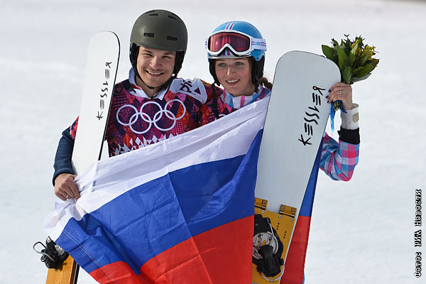 Вик Уайлд (Россия), завоевавший золотую медаль, и Алена Заварзина (Россия), завоевавшая бронзовую медаль, после окончания финала параллельного гигантского слалома на соревнованиях по сноуборду на XXII зимних Олимпийских играх в Сочи.