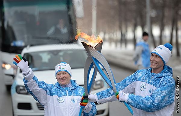 Заслуженный мастер спорта по лыжным гонкам и биатлону Алевтина Елесина и факелоносец Алексей Шаров во время эстафеты Паралимпийского огня в Екатеринбурге.