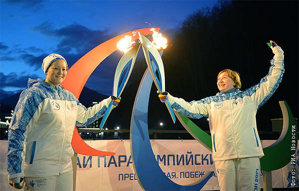 Редактор отдела спорта журнала "Русский репортер" Вера Михайлова (слева) и руководитель группы по работе с клиентами ООО "Орандж" Ольга Пантелеева во время эстафеты Паралимпийского огня в Сочи.