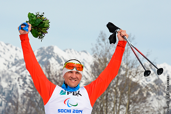 Роман Петушков (Россия), завоевавший золотую медаль в гонке на короткой дистанции в классе LW 10-12 (сидя) среди мужчин в соревнованиях по биатлону на XI Паралимпийских зимних играх в Сочи, во время цветочной церемонии.