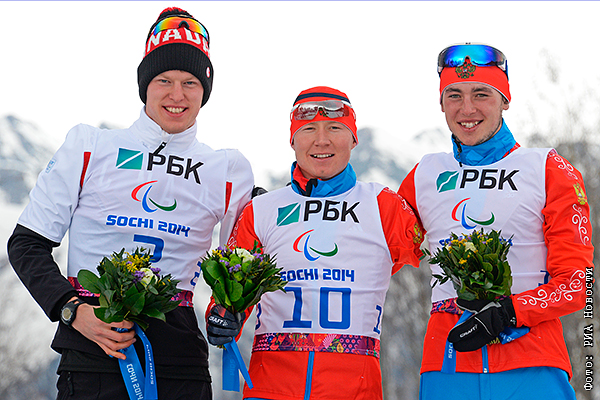 Призеры гонки на короткой дистанции в классе LW 2-9 (стоя) среди мужчин в соревнованиях по биатлону на XI Паралимпийских зимних играх в Сочи, во время цветочной церемонии (слева направо): Марк Арендс (Канада) - серебряная медаль, Владислав Лекомцев (Россия) - золотая медаль, Азат Карачурин (Россия) - бронзовая медаль.