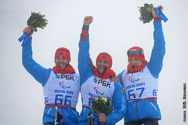Призеры гонки на средней дистанции в классе LW 10-12 (сидя) среди мужчин в соревнованиях по биатлону на XI Паралимпийских зимних играх в Сочи, во время цветочной церемонии (слева направо): Алексей Быченок (Россия) - серебряная медаль, Роман Петушков (Россия) - золотая медаль, Григорий Мурыгин (Россия) - бронзовая медаль.