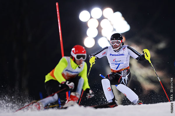 Валерий Редкозубов (Россия) и ведущий Евгений Героев (слева) на трассе слалома во второй попытке в классе B 1-3 (слабовидящие) на соревнованиях по горнолыжному спорту среди мужчин на XI Паралимпийских зимних играх в Сочи.