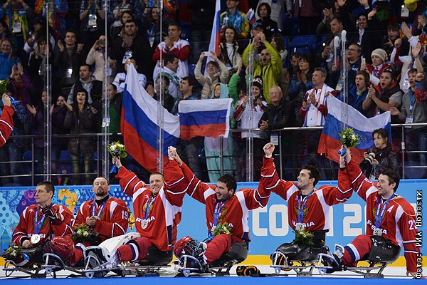 Игроки сборной России, завоевавшие серебряные медали на соревнованиях по следж-хоккею на XI зимних Паралимпийских играх в Сочи, во время медальной церемонии.