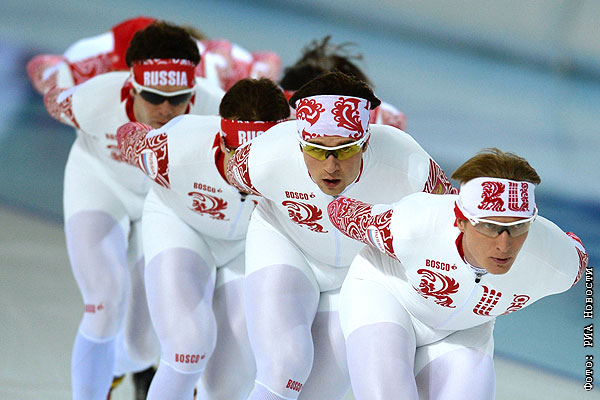 Справа налево: Иван Скобрев и Денис Юсков (Россия) на тренировке перед началом XXII зимних Олимпийских игр в Сочи.
