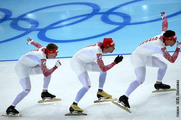 Спортсмены сборной России на тренировке перед началом XXII зимних Олимпийских игр в Сочи.