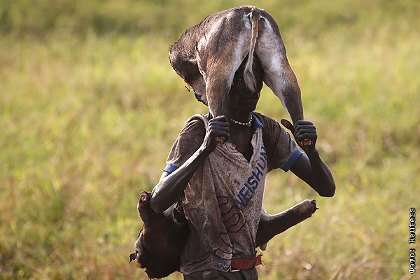 Южный Судан. Мятежник тащит на голове заднюю часть туши антилопы.