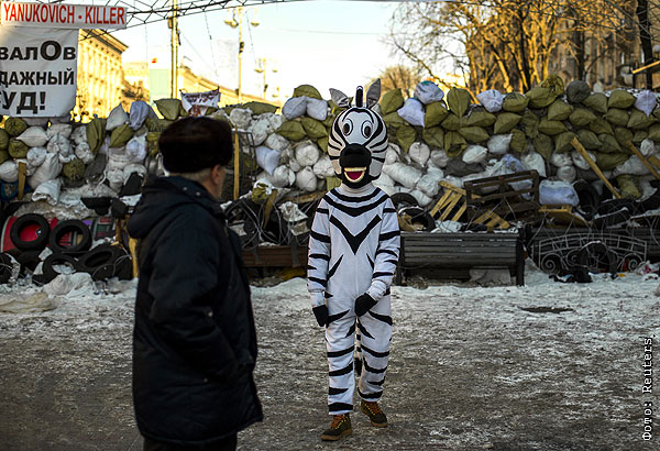 Зебра гуляет по Майдану не просто так. За определенную сумму с ней можно сфотографироваться на фоне баррикад.