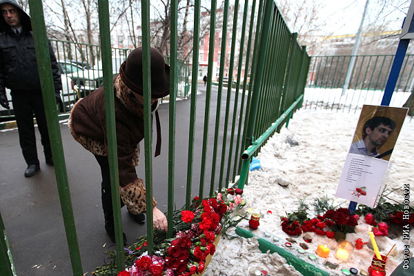 Женщина возлагает цветы у московской школы № 263, в которой 3 февраля ученик этой школы захватил заложников и убил двух человек.