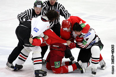 Игроки "Авангарда" Яромир Ягр (слева), Тимофей Шишканов (справа) и "Витязя" Дарси Веро, Александр Романов (в центре слева направо) во время драки на матче регулярного чемпионата КХЛ между омским "Авангардом" и подмосковным "Витязем"