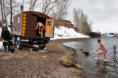 Посетители передвижной бани во время отдыха на берегу Енисея