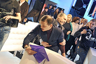 Депутата от БЮТ Олега Ляшко (в центре) пытаются вывести из телестудии. Перед началом прямого эфира программы "Шустер Live" на телеканале "Украина" Олег Ляшко без приглашения зашел в студию и требовал предоставить ему слово в эфире