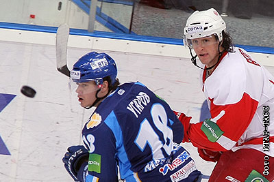 Игроки ХК МВД Алексей Угаров и "Витязя" Дарси Веро (слева направо) в матче чемпионата КХЛ: ХК МВД (Московская область) - "Витязь" (Чехов)