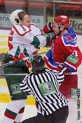 Игрок "Ак Барса" Алексей Бадюков и армеец Николас Димитракос (слева направо) в матче чемпионата КХЛ: ЦСКА (Москва) - "Ак Барс" (Казань)