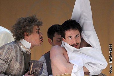 Актеры Шамиль Хаматов (Егор Лебедынцев) и Артур Смольянинов (Ларион Рыдлов) (слева направо) в сцене из спектакля Евгения Каменьковича "Джентльменъ" в театре "Современник"