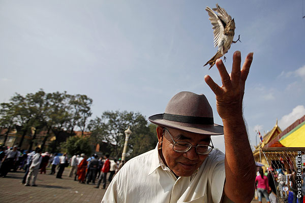 Камбоджа. Участник протеста против задержания 23 оппозиционеров выпускает на волю птицу на площади перед королевским дворцом.