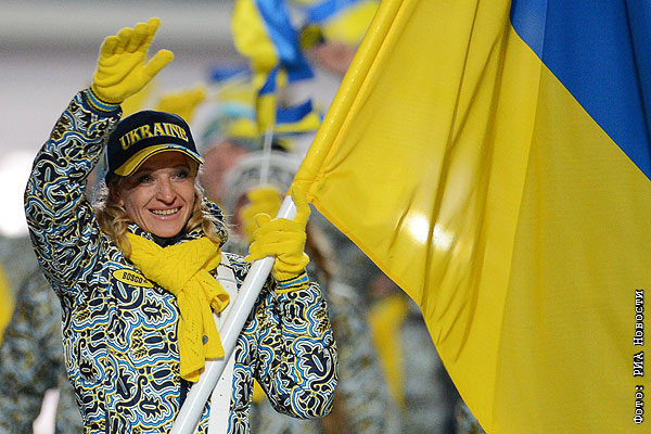 Знаменосец сборной Украины Валентина Шевченко во время парада атлетов и членов национальных делегаций на церемонии открытия XXII зимних Олимпийских игр в Сочи.