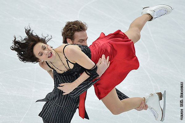 Натали Пешала и Фабьян Бурза (Франция) выступают в короткой программе танцев на льду командных соревнований по фигурному катанию на XXII зимних Олимпийских играх в Сочи.