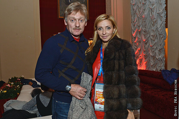 Фигуристка Татьяна Навка и пресс-секретарь президента РФ Дмитрий Песков в корпоративном доме "Боско" в здании Морвокзала в дни проведения ХХII зимних Олимпийских игр в Сочи.