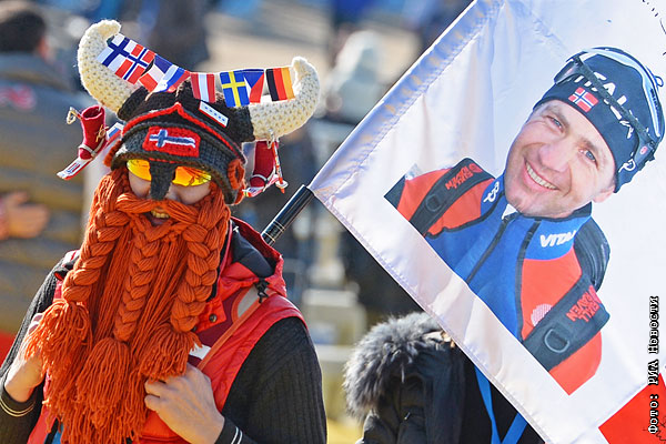 Болельщик норвежского биатлониста Уле-Айнара Бьорндалена, с портретом своего кумира, в Олимпийском парке в Сочи.