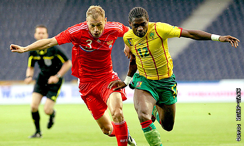 Игроки сборной России Василий Березуцкий и сборной Камеруна Анри Бедимо (слева направо) во время товарищеского матча Россия - Камерун - 0:0
