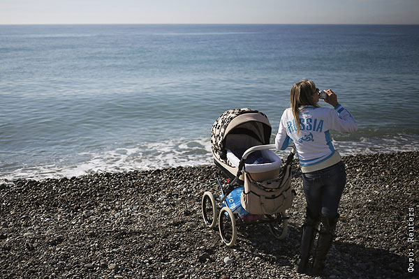 Женщина с коляской и прохладительным напитком на берегу Черного моря.