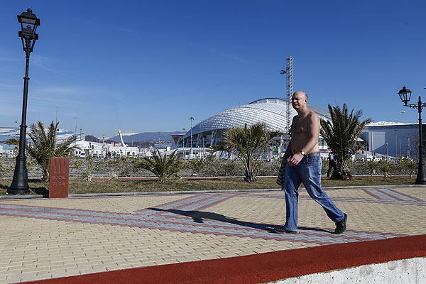 Мужчина снял рубашку и прогуливается по набережной Олимпийского парка. Где-то вдали горит огонь зимней Олимпиады.