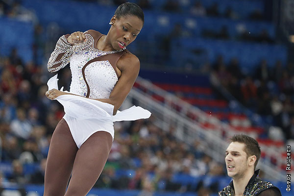 Ванесса Джеймс и Морган Сипре (Франция) выступают в произвольной программе парного катания на соревнованиях по фигурному катанию.