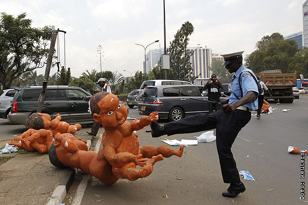 Кенийский полицейский пинает брошенные протестующими в Наироби фигуры из папье-маше.