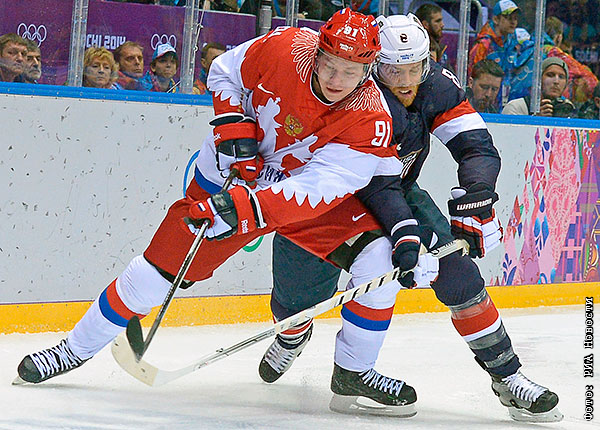 Слева направо: Владимир Тарасенко (Россия) и Джо Павелски (США) в матче группового этапа между сборными командами США и России на соревнованиях по хоккею среди мужчин на XXII зимних Олимпийских играх в Сочи.