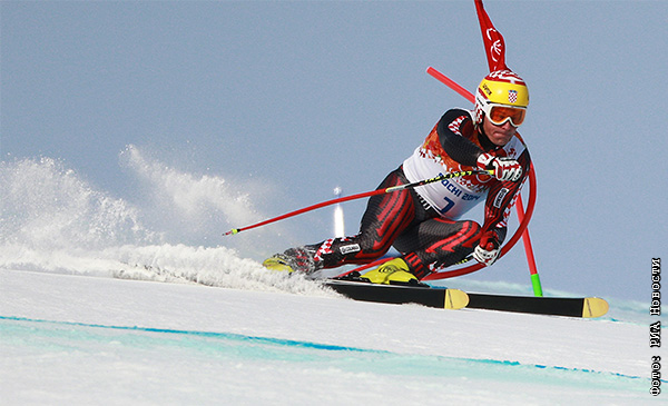 Ивица Костелич (Хорватия) на трассе слалома-супергиганта на соревнованиях по горнолыжному спорту среди мужчин на XXII зимних Олимпийских играх в Сочи.