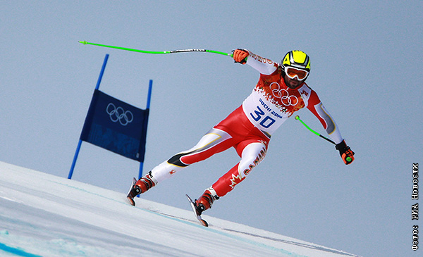 Мануэль Осборн-Паради (Канада) на трассе слалома-супергиганта на соревнованиях по горнолыжному спорту среди мужчин на XXII зимних Олимпийских играх в Сочи.