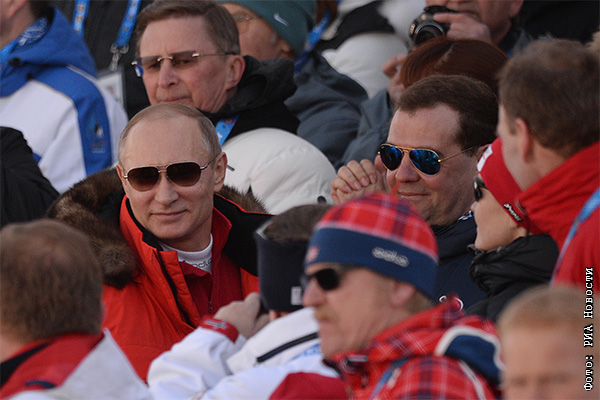 Президент России Владимир Путин и председатель правительства России Дмитрий Медведев (слева направо на втором плане) на трибуне во время эстафеты в соревнованиях по лыжным гонкам среди мужчин на XXII зимних Олимпийских играх в Сочи.