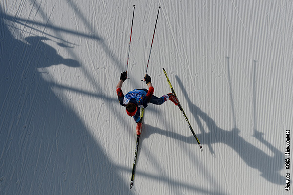 Максим Вылегжанин (Россия) на дистанции эстафеты в соревнованиях по лыжным гонкам среди мужчин на XXII зимних Олимпийских играх в Сочи.